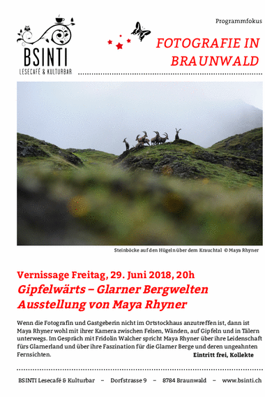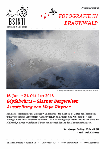 Die Glarner Bergbilder von "Gipfelwärts – Glarner Bergwelten" sind noch bis am 21. Oktober 2018 im Bsinti in Braunwald zu sehen. Herzlich. Maya.